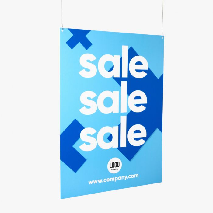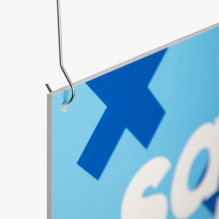 Breng je boodschap hoog in de lucht met een plafondhanger op maat. Deze paneel is sterk en licht, waardoor hij uitstekend geschikt is voor toepassing in winkels, beurzen of showrooms. Je hebt de keuze uit verschillende materialen die allemaal licht van gewicht zijn en makkelijk te hangen. De plafondhanger kan zowel enkelzijdig als dubbelzijdig bedrukken, waardoor je veelzijdige designs kunt realiseren. Met boorgaten en plafondhaken monteer je de hanger snel en stabiel. De plafondhaken zijn al beschikbaar vanaf formaten van 15, 21 of 35 cm.
